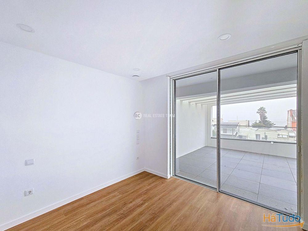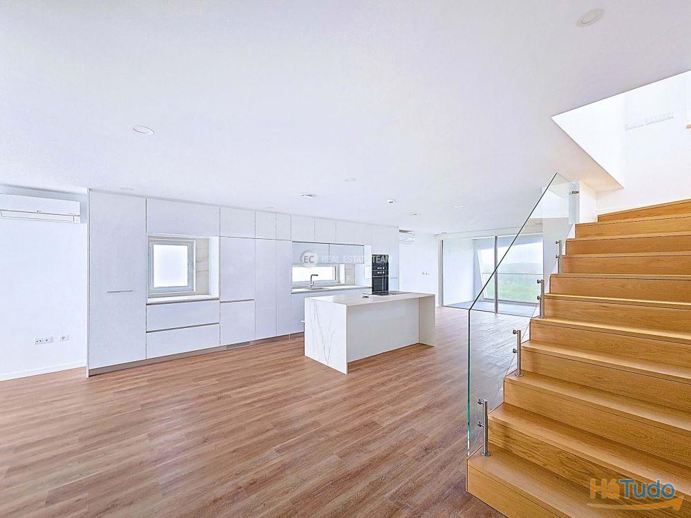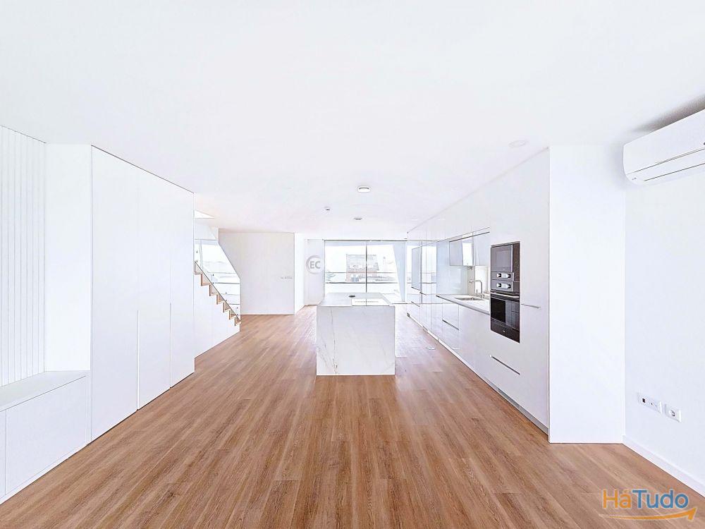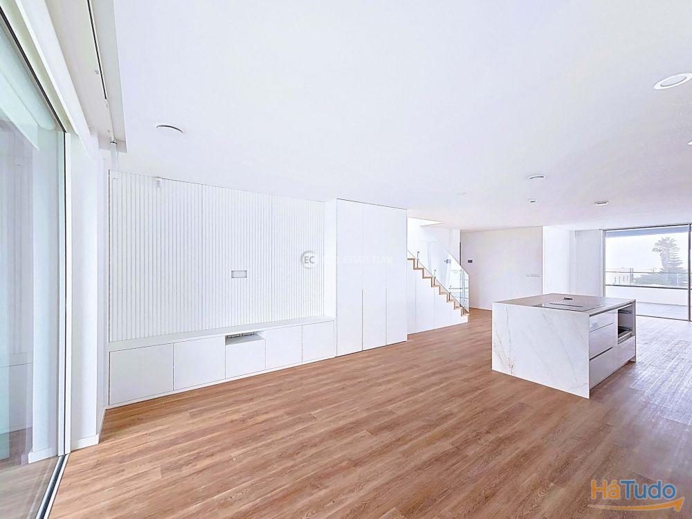 T3 duplex, orientação solar nascente poente, último andar, totalmente novo Zona social virada a poente: sala de estar, sala de jantar e cozinha em open space com acesso a varanda (possibilidade de fechar) e vista direta para o mar Três quartos, sendo um em suíte Duas casas de banho completas: uma privativa da suíte e outra de apoio à área social e aos outros 2 quartos Varandas amplas para desfrutar das vistas e da luz natural