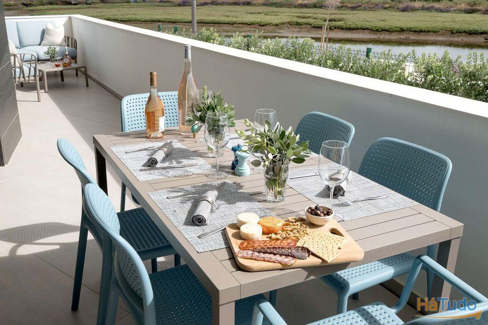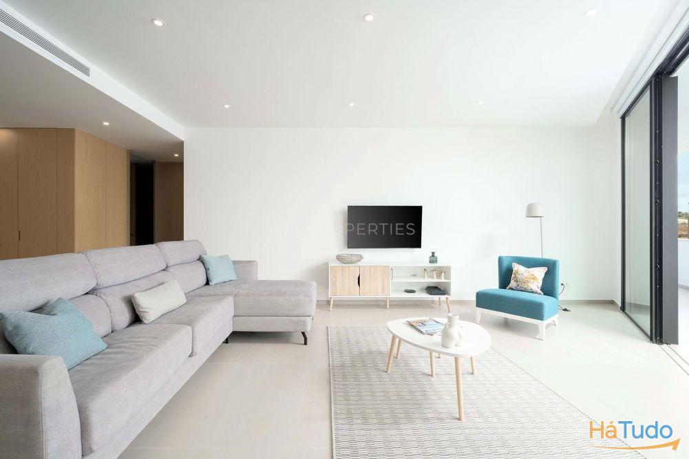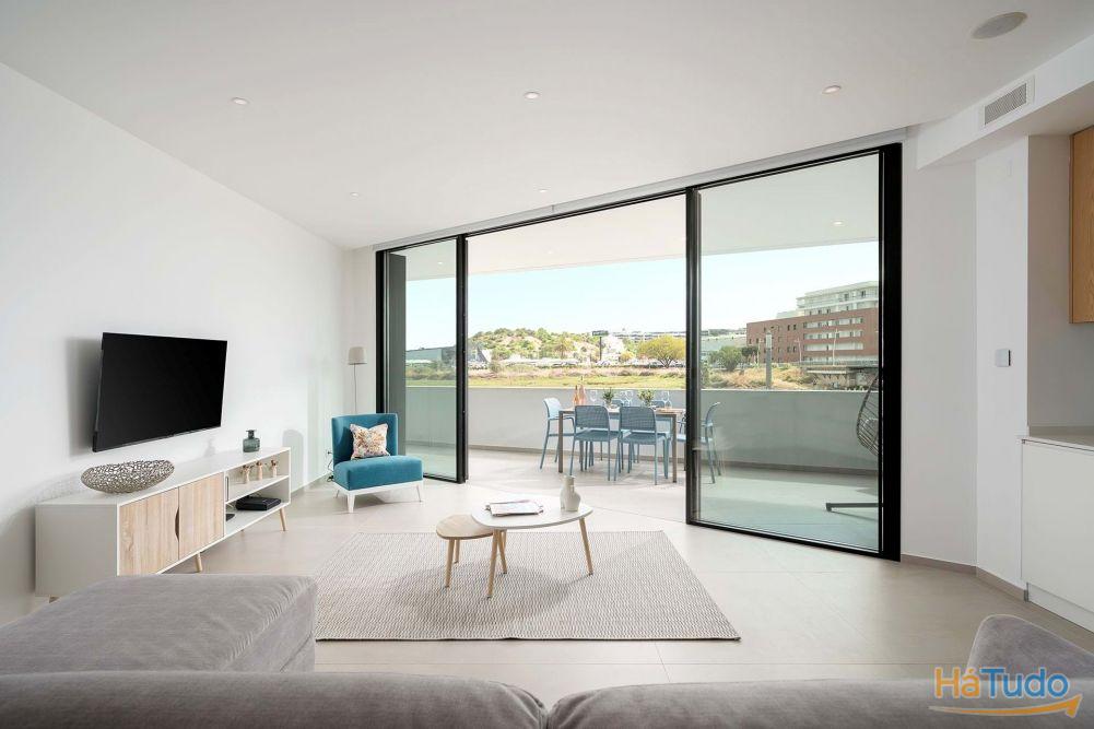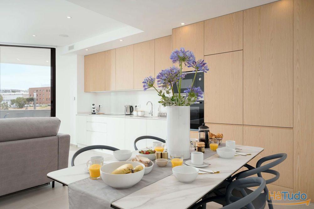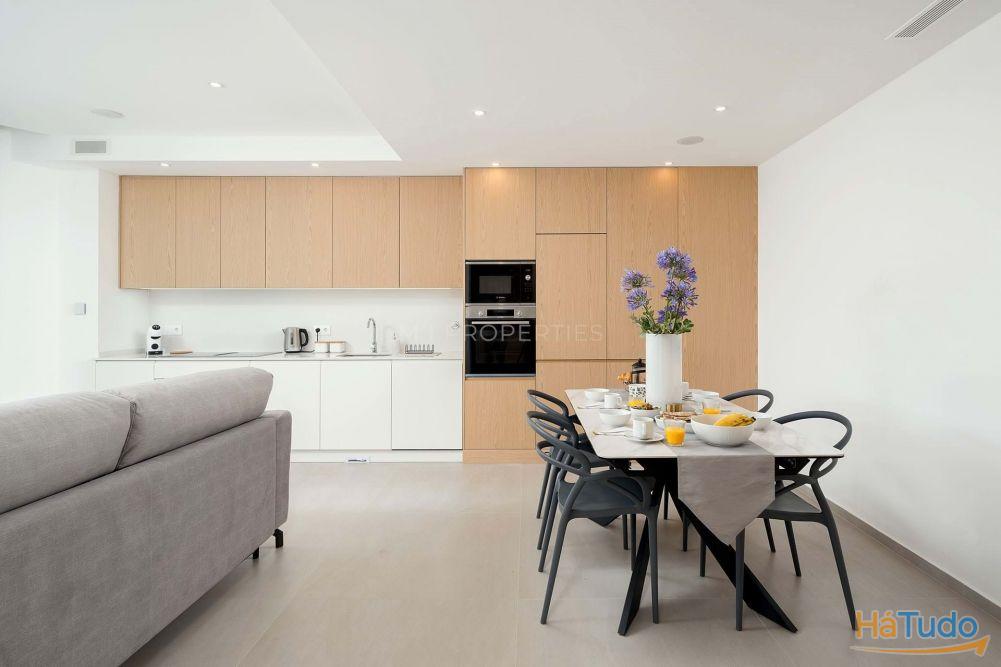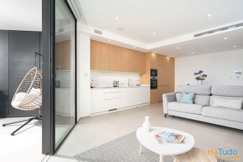 O apartamento dispõe de uma espaçosa zona de estar e jantar em open space, complementada por uma cozinha moderna totalmente equipada com eletrodomésticos Bosch. A distribuição foi pensada para um conforto durante todo o ano, com acesso direto à área exterior.