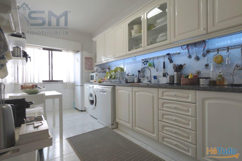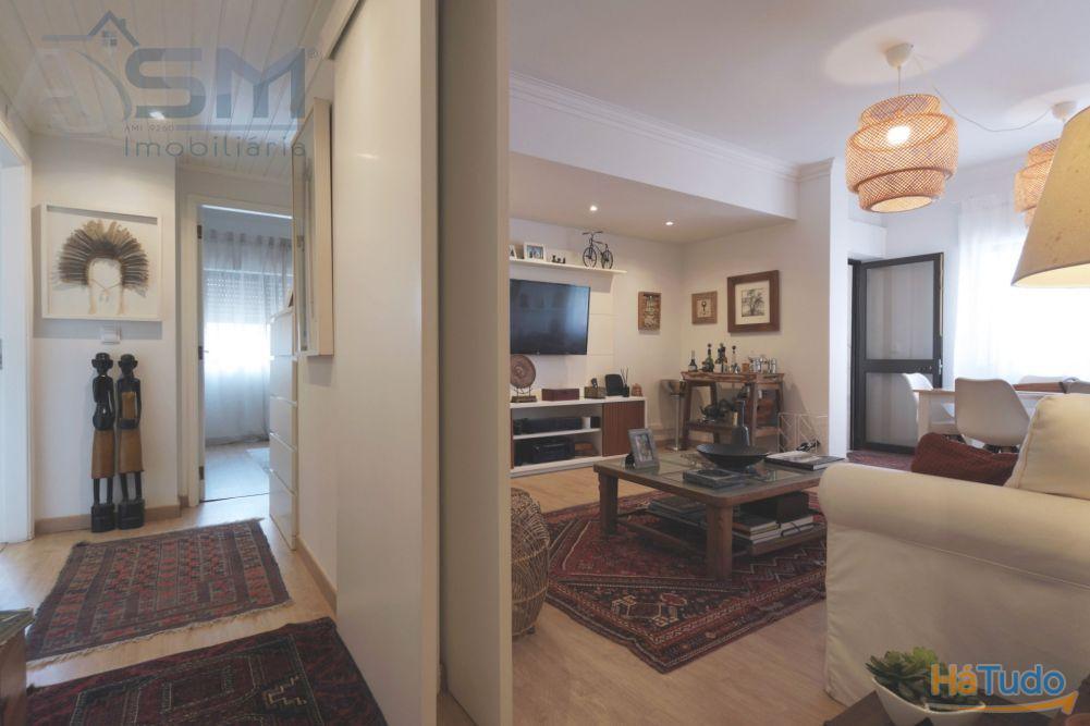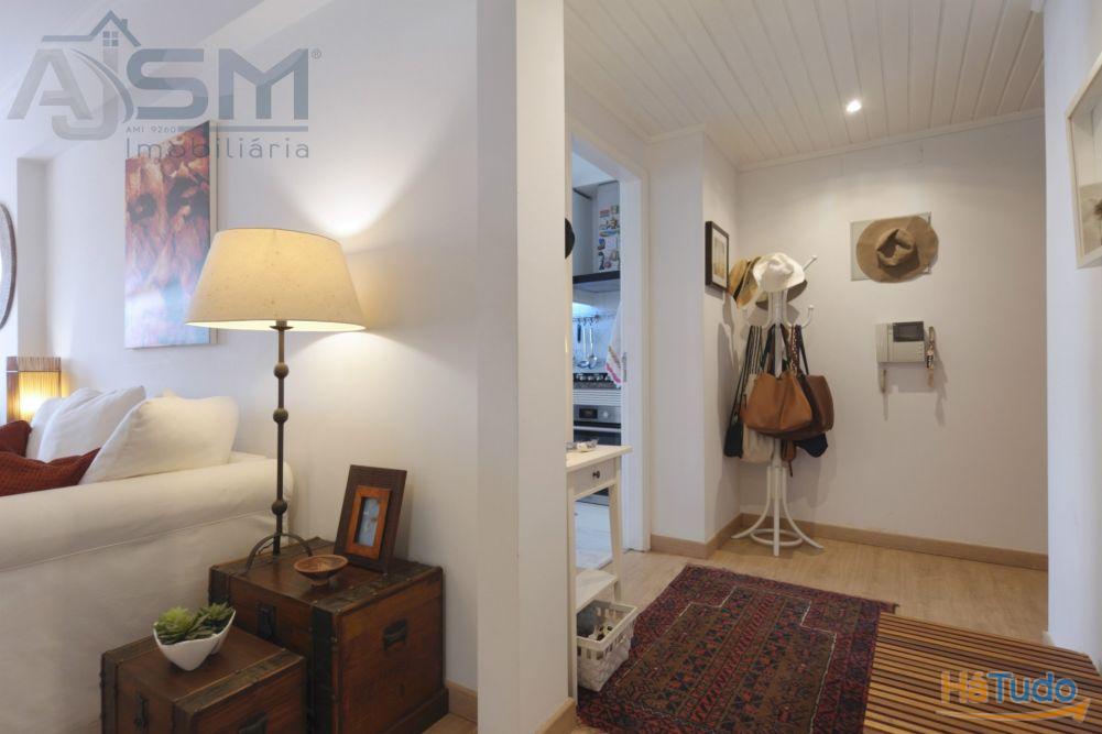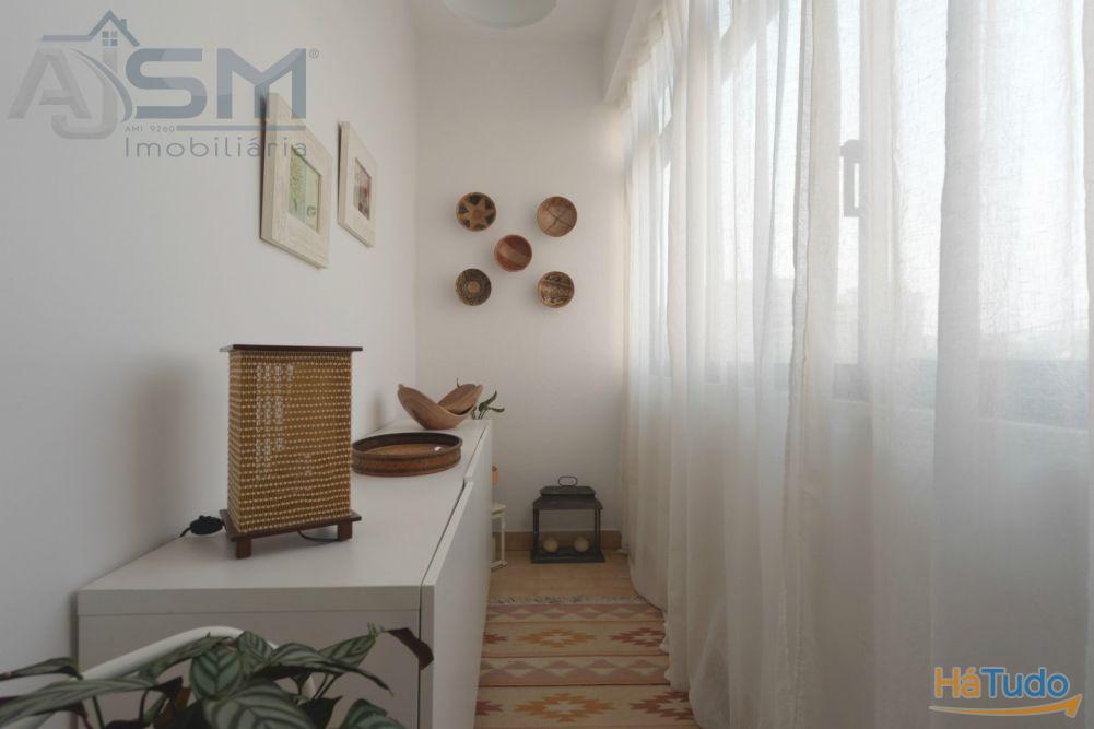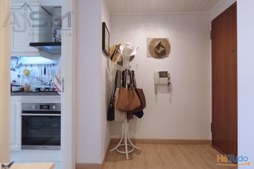 Apartamento com áreas generosas e acabamentos modernos e funcionais, sendo composto por hall de entrada com teto falso em madeira, sala de estar com lareira e uma boa varanda fechada, corredor amplo com uma despensa com prateleiras, cozinha equipada com eletrodomésticos básicos, um quarto amplo com roupeiro embutido e uma casa de banho privativa com cabine de duche e janela.