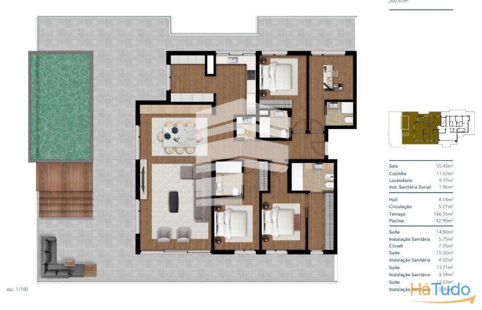 Apartamento T4 no último piso composto por: sala (55.43m2), cozinha (11.62m2), lavandaria (9.37m2), casa de banho social (1.96m2), hall (4.14m2), Circulação (5.27m2), terraço (146.55m2), piscina, suite 1 (14.86m2) com casa de banho (5.57m2) e closet (7.25m2), suite 2 (15.35m2), closet , casa banho (4.32m2), suite 3 (13.71m2), casa de banho (3.59m2), suite 4 (12.03m2), casa de banho (3.05m2)