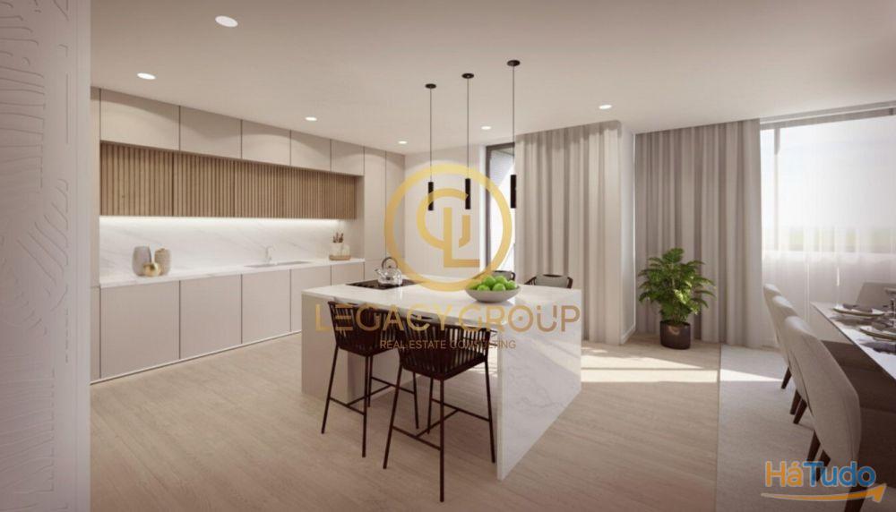 Zona Social: Uma sala ampla banhada por luz natural, com ligação fluida a uma cozinha de design moderno e minimalista, criando o ambiente perfeito para convívio.