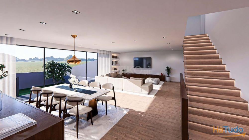 No piso principal encontra uma ampla sala e cozinha em open space, criando um ambiente acolhedor e ideal para convívio. A moradia dispõe ainda de 3 quartos em suite, garantindo total privacidade e comodidade, e de um escritório com Wc, perfeito para quem trabalha a partir de casa ou necessita de um espaço de estudo tranquilo.