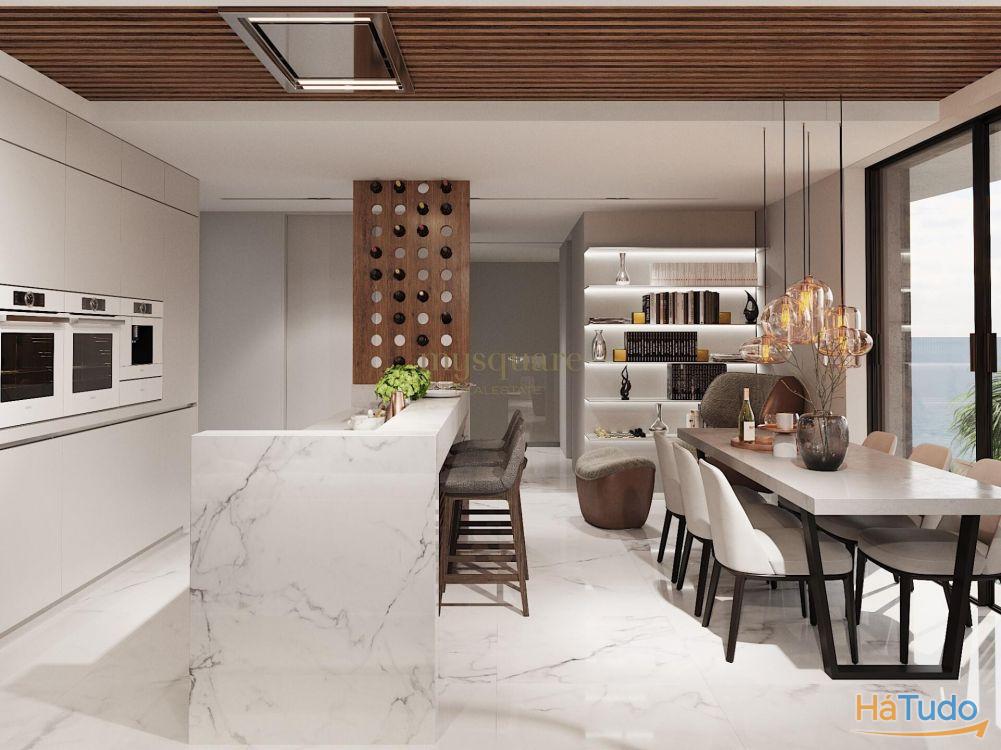 Sala de estar ampla em plano aberto, conectada à cozinha moderna equipada com bar e parede de vinhos.