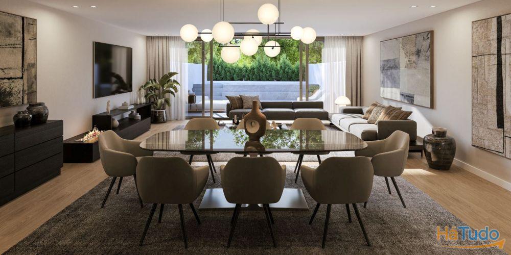 No primeiro piso a zona social, com wc de serviço, cozinha totalmente equipada com ilha central e sala espaçosa com cerca de 60m2 que comunica com um fantástico terraço.