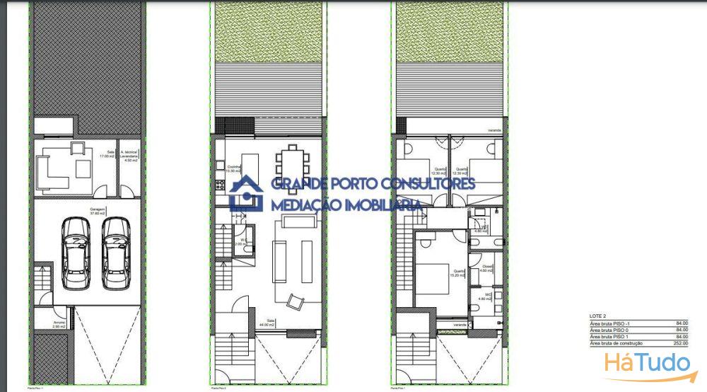 Moradia V3, 2 frentes, com 3 suítes, garagem fechada para 2 carros, varandas, terraços e jardim.