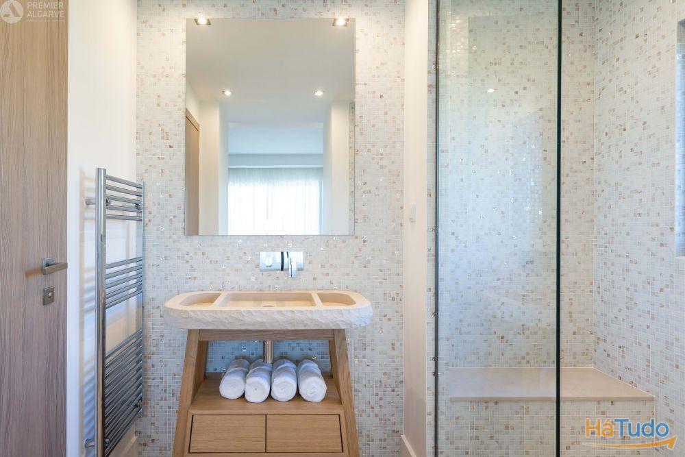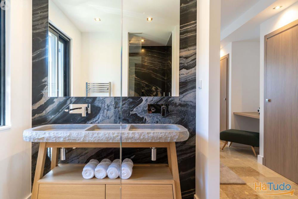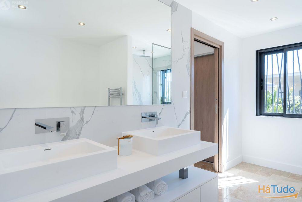 Cozinha equipada com eletrodomésticos Samsung, LG ou Bosch (pia dupla, torneiras, forno, placas de indução, exaustor integrado na ilha central) Secador de toalhas de parede Base de chuveiro extraplana