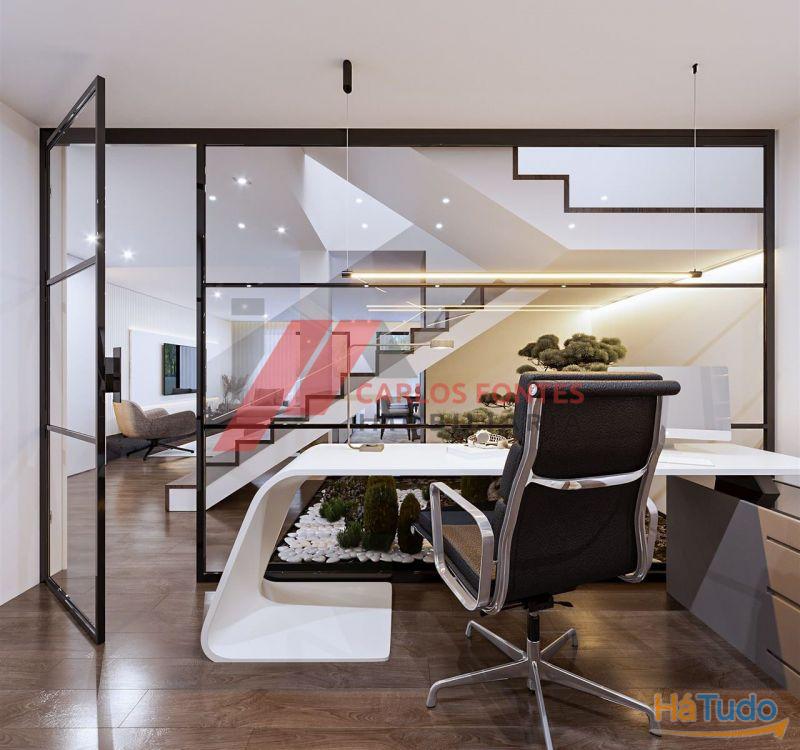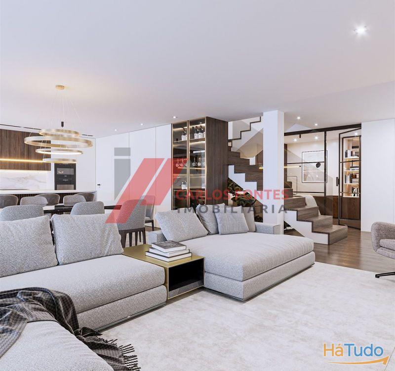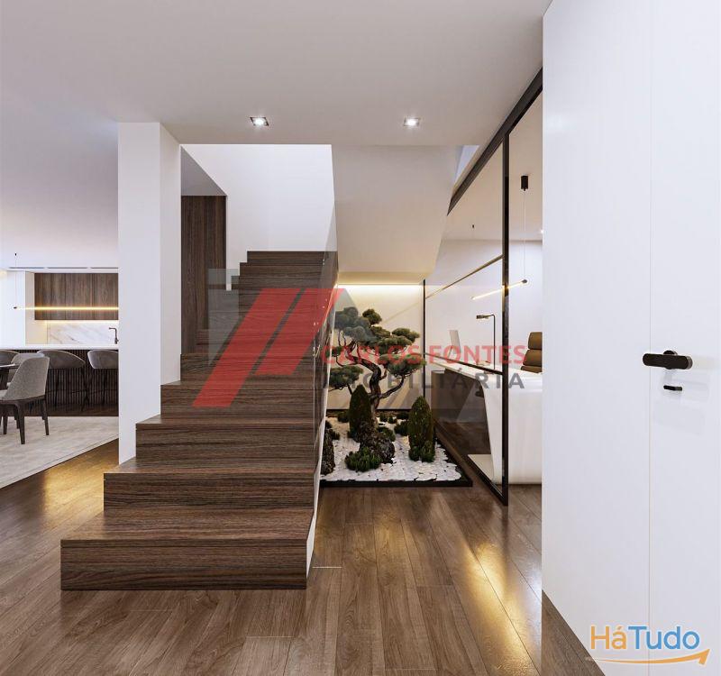Embora, quem vislumbra da rua aparentam ser térreas, onde encontramos a garagem fechada para dois carros lado a lado, com armários em toda a parede frontal para arrumações, em seguida temos um amplo hall de entrada com vitral para entrada de luz natural. A zona social desenvolve-se no piso inferior, onde temos o escritório com parede em vidro, casa de banho completa e em seguida o ponto forte das moradias, que são as excelentes áreas da Sala de Estar, Sala de Jantar e Cozinha, tudo em open space para não haver separação dos ambientes e poderem estar todas as pessoas a conviver em perfeita harmonia, perfazendo esses espaços 58 m2 no total. E para melhorar o ambiente, contamos com três vãos de janelas muito grandes voltados a sul poente, onde luz natural será sempre garantida. Junto à cozinha temos ainda, a lavandaria que conta com 14 m2 onde fica a bomba de calor, o espaço para as máquinas de lavar e secar roupa e armários de apoio para arrumações.
