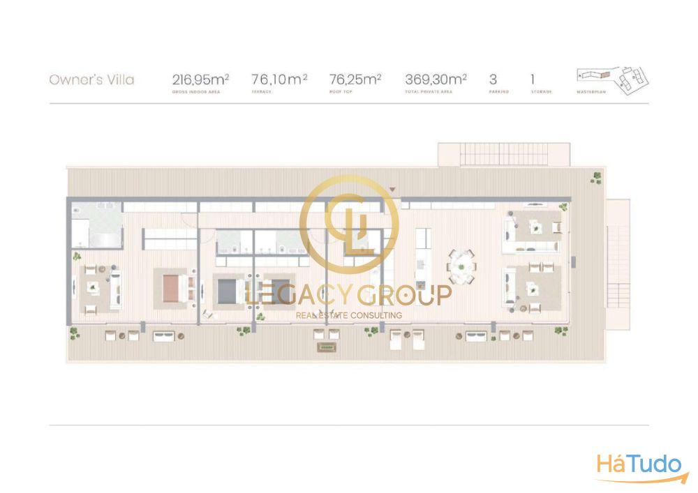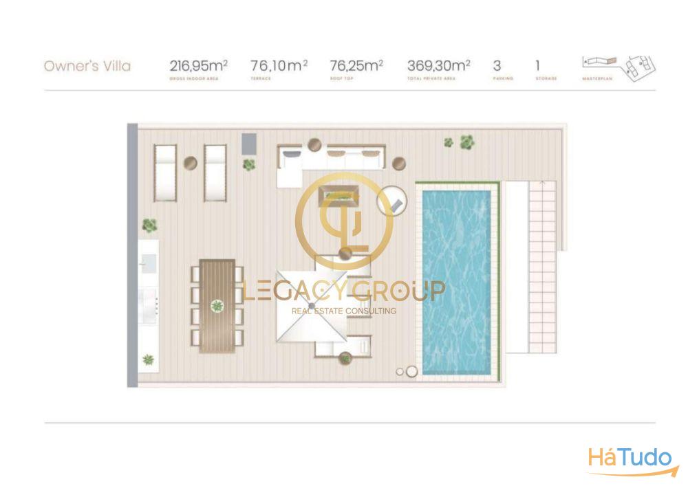 ? Localizado no último andar do resort de luxo de Nomad Bay, com vista de 360°. Esta penthouse moradia tem uma área total de 370 m2, e é um apartamento T4 com 216m2 de área interior, um terraço envolvente com 76m2 e uma fantástica cobertura com 76m2.