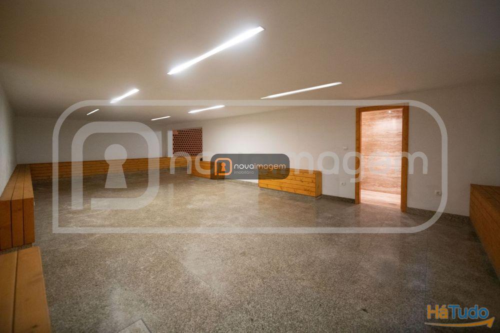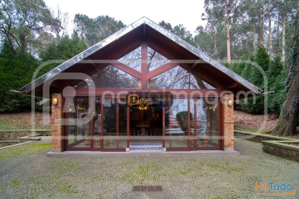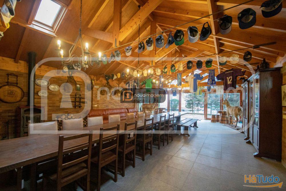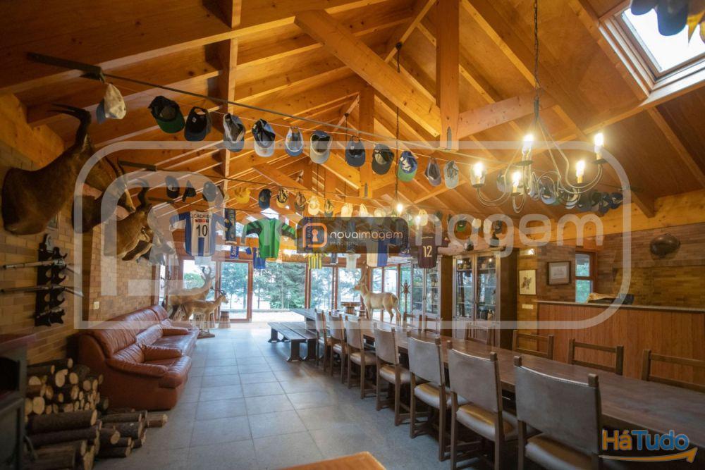 O salão de festas envidraçado e com bastante luz natural, possui um espaço amplo com salamandra, cozinha completa com forno a lenha e churrasqueira com espetos rotativos, garrafeira e ainda wc.