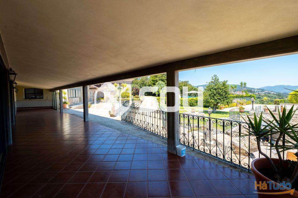 Piso superior: sala de estar com lareira e alpendre coberto, sala de jantar com 40 m² e lareira, cozinha tradicional com 30 m², quatro quartos e duas casas de banho completas;
