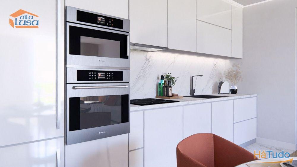 Cozinha equipada com eletrodomésticos Frigorífico, exaustor, placa de indução, forno, micro-ondas e máquina de lavar a loiça
