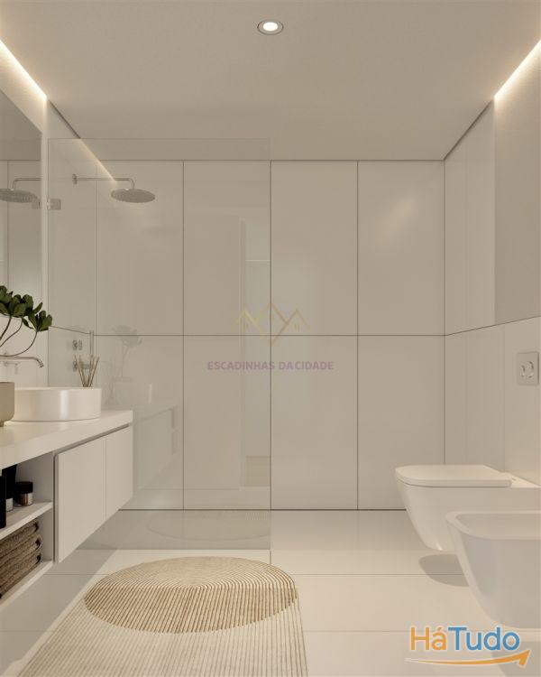 Casa de banho com pavimento em mosaico cerâmico branco mate, paredes com acabamento cimentício envernizado, sanitários suspensos, lavatório esculpido em resina sintética, autoclismos embutidos, espelho e torneiras cromadas
