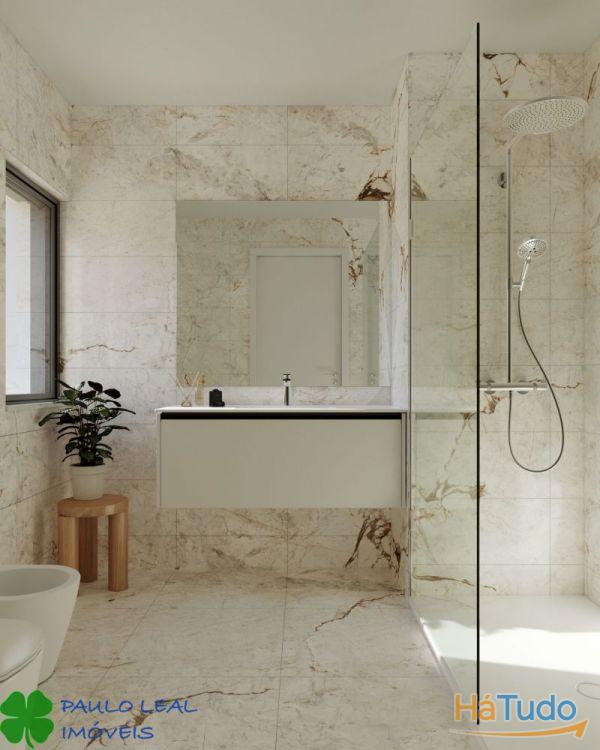 CASA DE BANHO DA SUITE / CASA DE BANHO COMUM ?Pavimentos:revestimentocerâmico60x60cmda?Grespania?,ouequivalente; ?Paredes:rebocadascomrebocohidrófugoerevestimentofinalemcerâmicoda?Grespania?,ouequivalente; ?Tetosfalsosemgessocartonadohidrófugopintado,comiluminaçãocomfocosembutidos; ?MóvelsuspensoemMDFhidrófugolacado; ?Loiçassanitáriascompactasda?SANINDUSA?,série?LOOK?ouequivalente; ?Basesdeducheem?Stonit?da?SANINDUSA?,série?MARINA?ouequivalente; ?Misturadorasda?HANSGROHE?,série?VERNISBLEND?ouequivalente; ?Resguardosemvidronãoincluídos.