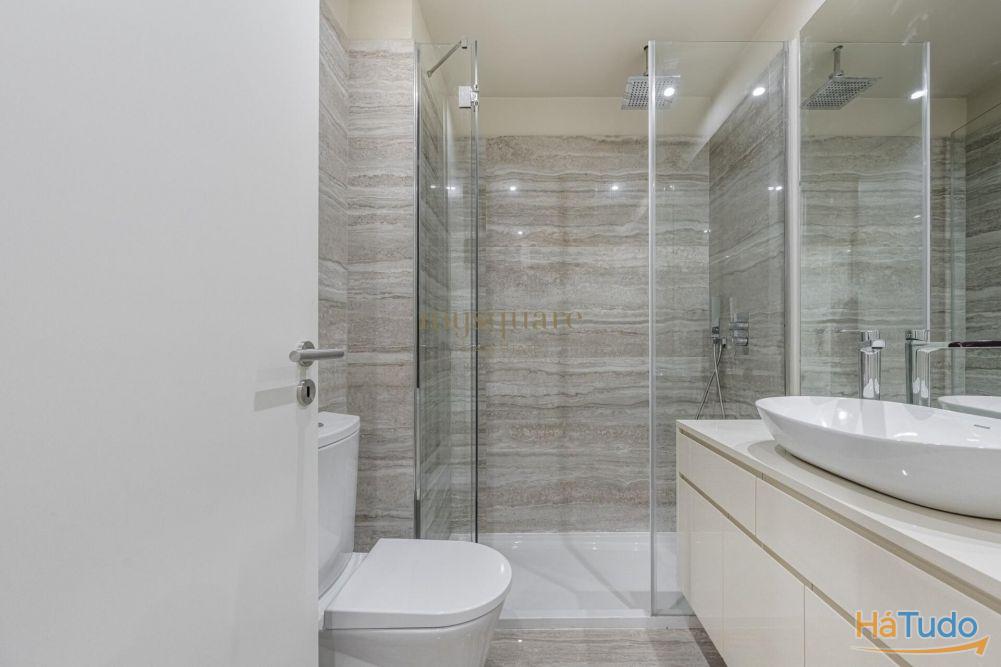 ? WC de serviço dos T3?s com pavimento em madeira flutuante de Carvalho e paredes estanhadas pintadas, contrapondo com parte em cerâmica retificada de grande formato;