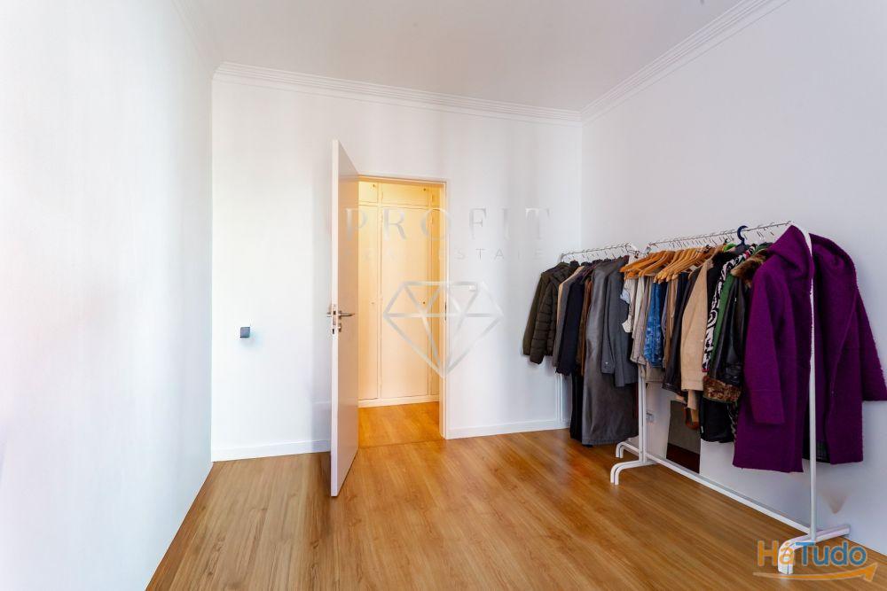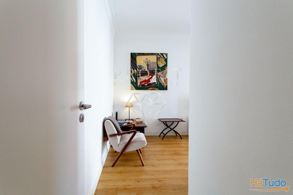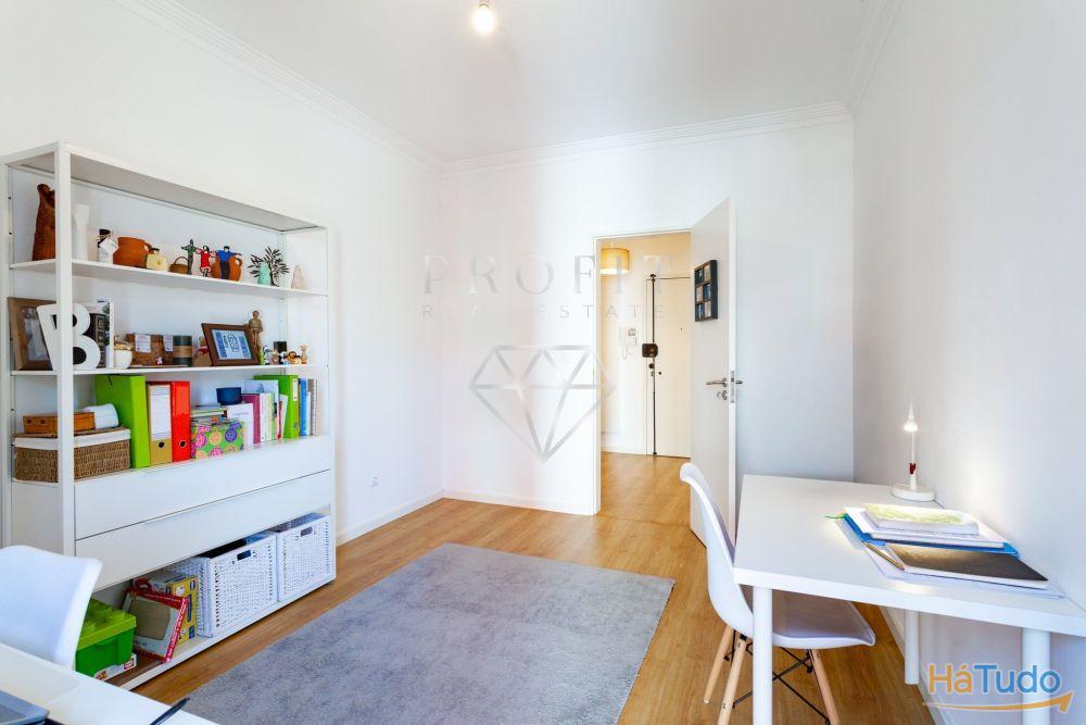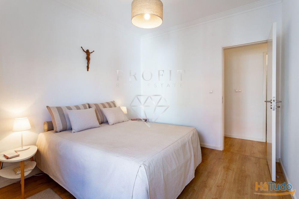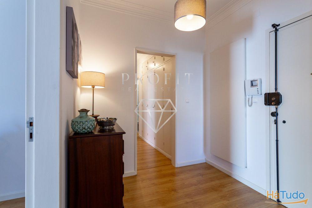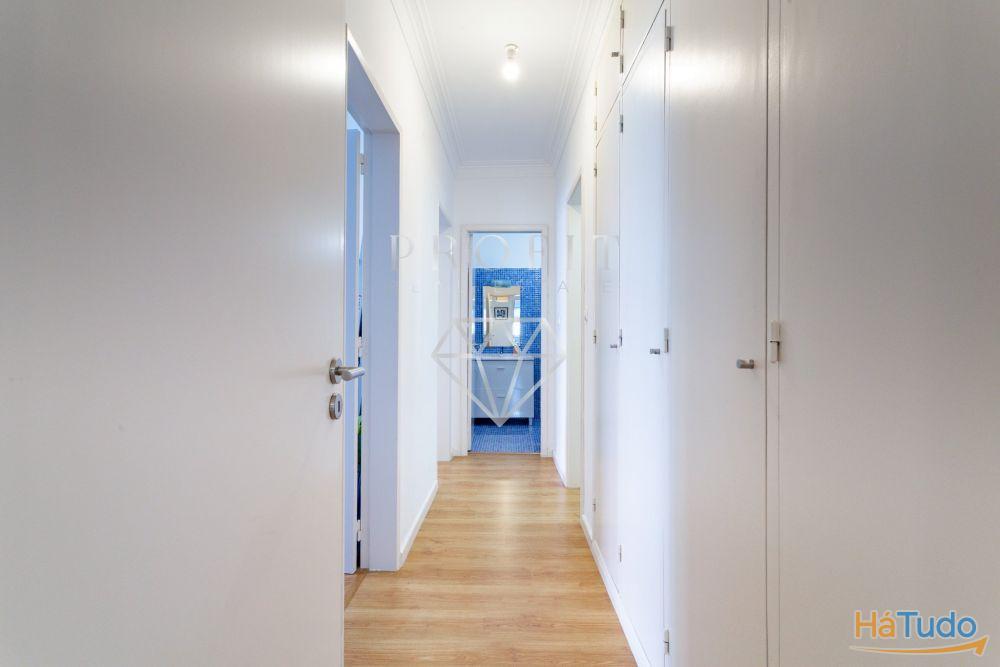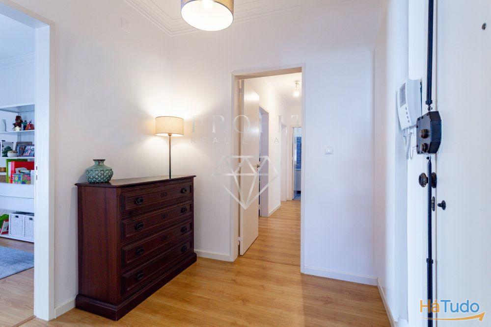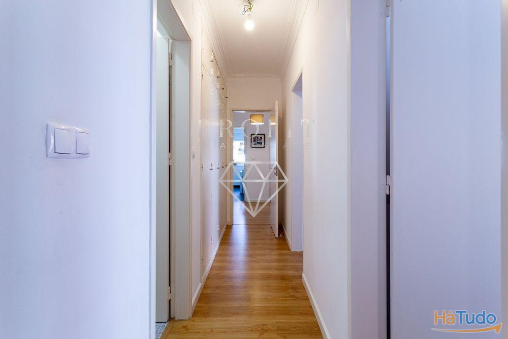 Apartamento composto por três quartos, um roupeiro no corredor dos quartos, cozinha equipada, duas casas de banho (uma completa e outra social) e uma varanda. Apartamento em excelente estado de conservação.