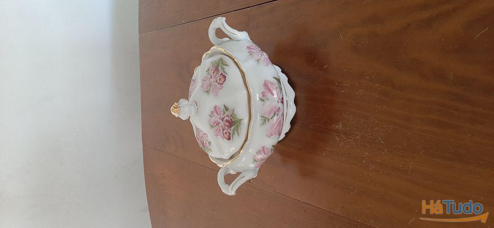 Terrina média de decoração em louça colorida com tampa.